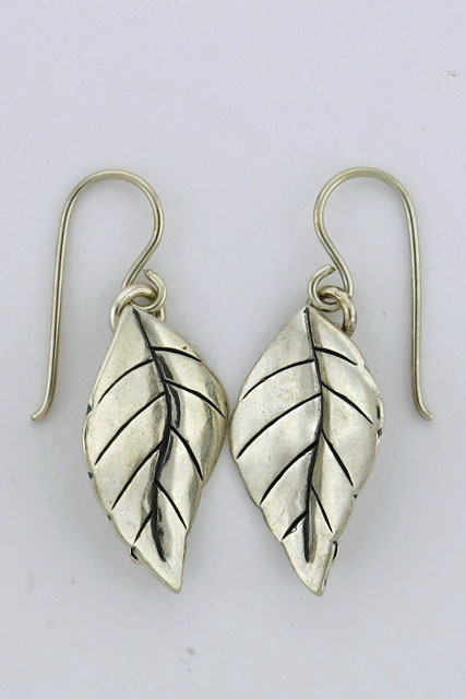Handcrafted sterling silver leaf earrings on hanging wires.