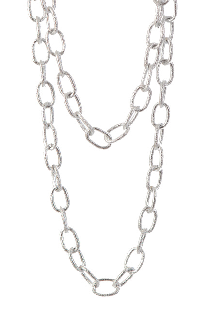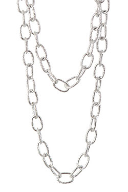 A shiny, long, unites, silver chain necklace. Leave it long or loop it around the neck.
