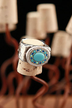 Hand made, sterling silver band with Blue and Turquoise Swarovski Crystal stones.