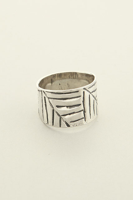 Hand made, sterling silver, slashed band with oxidation curves.