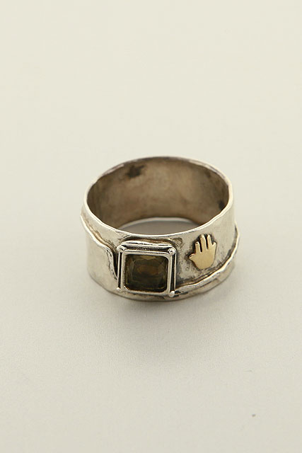 Hand made, two tone band with gold Hamsa on one side and Smoky Quartz stone in its center.