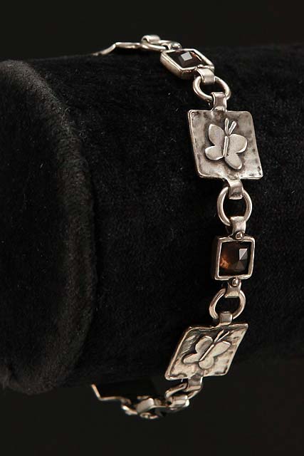Hand made, alternating, sterling silver bracelet with butterflies panels and Smoky Quartz stones mounted to a toggle finish.