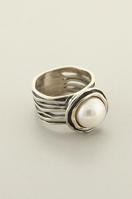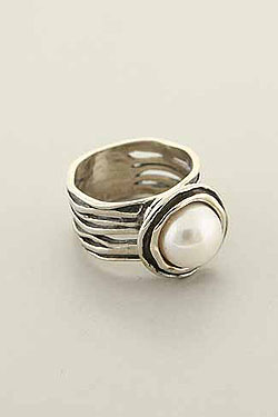 Unique, hand made, sterling silver, radiated pearl ring sets in a bay.