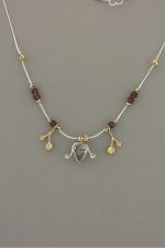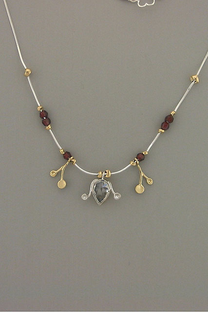 Hand made, two tone, contemporary necklace with a Clear Crystal and Garnet stones; Sterling silver, gold and gold field beads.Chain: 16 inches long; Pendent 0.5 ion. Long.