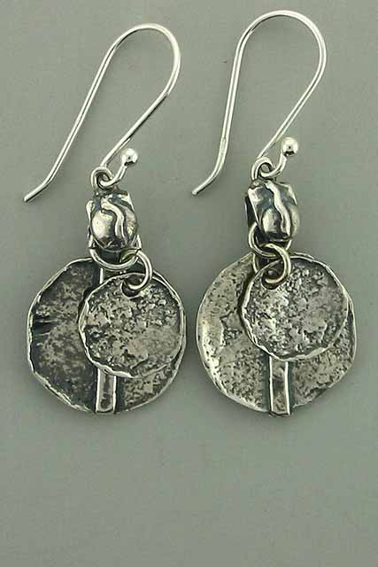 Hand made, round, sterling silver, contemporary and oxidized, double palltes earrings. One item only. Earrings: 1.75 in. long.