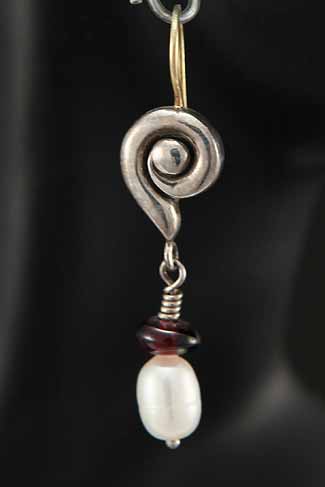 Hand made, two tone, hanging earrings with Garnets and white fresh water pearls on gold wires.