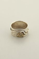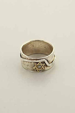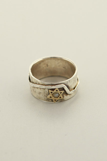 Two tone, sterling silver band that is a fashion design mixed with a Jewish Star David in 14k gold, maintaining a life spirit.
