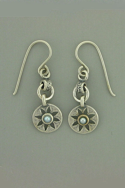 Hand made, hanging, round earrings with sunny beaming lights and white pearls.