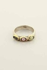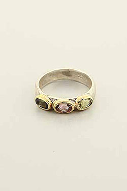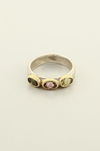 Hand made, two tone ring with three Tourmaline stones sets in gold.