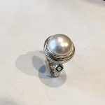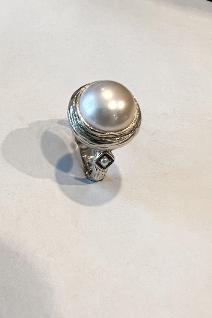 Textured sterling ring topped with large white pearl and two small pearls on its