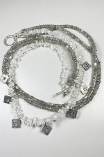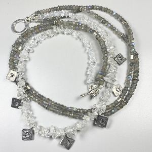 Three Layers necklace twisted. Two layered with Labradorite beads and one layer with moonstone chip stones and sven small sterling silver dangling motives.