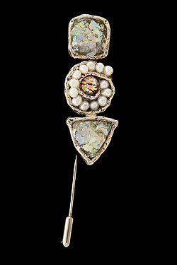 Hand made, one of a kind, Roman Glass pin with sterling silver and white pearls. For Hats or clothing.