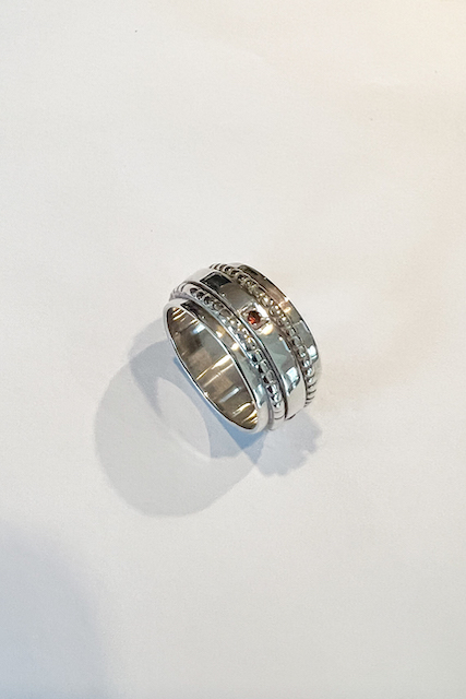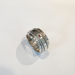 Wide sterling silver band with three revolving rings and four garnet stones.