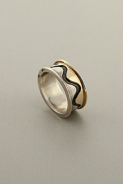 Hand made, two tone, gold wavy duplicated to sterling silver band with an oxidized line curved in between.