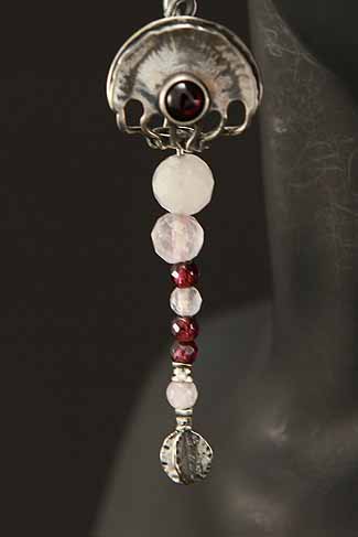 Hand made, contemporary, sterling silver dangling earrings with Rose Quartz and Garnet stones.