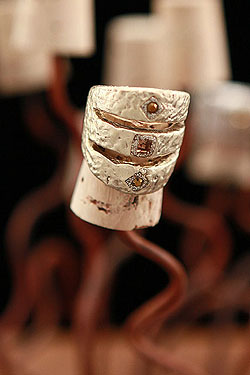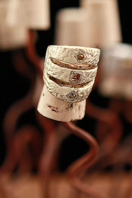 Hand made, 24K gold plated on top of sterling silver band with Smoky Crystal Swarovski stones. Light wear band.