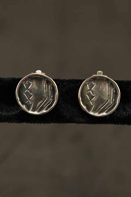 An oxidized, sterling silver, clip on, button earrings with an ocean abstract./