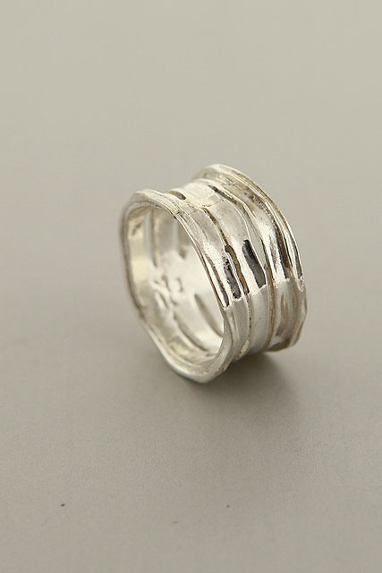 Hand made, sterling silver, wide, shiny, splits band with curled edges.