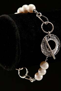 Hand made, contemporary, sterling silver bracelet and White Pearls with a beautiful toggle to finish.