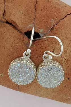 Small, round sterling silvery earrings with white Druzy stones on a sterling silver wires.