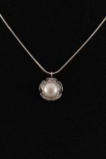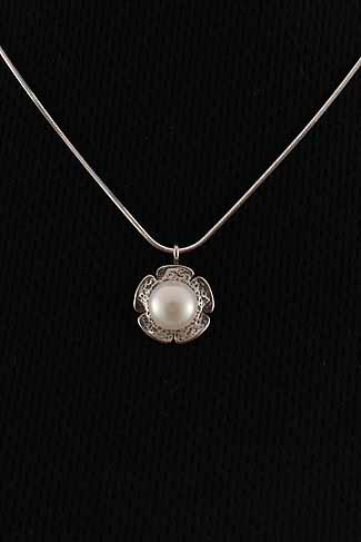 Hand made, sterling silver necklace with White Pearls and a sterling silver ruffle.