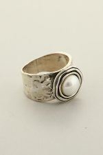Hand made, sterling silver band with White Pearl in a spirally bay.