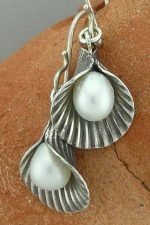 Hand made, sterling silver cone shell earrings with white pearls sets inside on sterling wires. One item only. Earrings: 1.25 in. long.