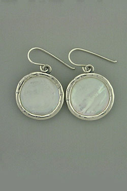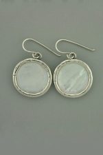 Hand made, sterling silver of a white round Mother Of Pearl, hanging earrings.