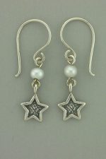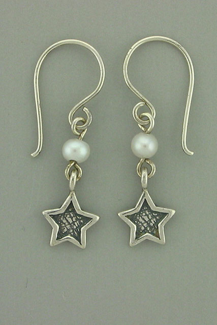 Hand made, sterling silver earrings with small hanging white Pearls and stars.