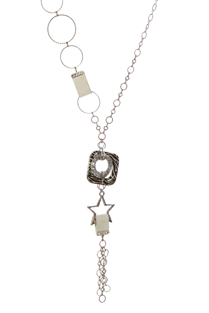 A wonderful, contemporary, long silver plated necklace with white leather, zebra button to a silver star.