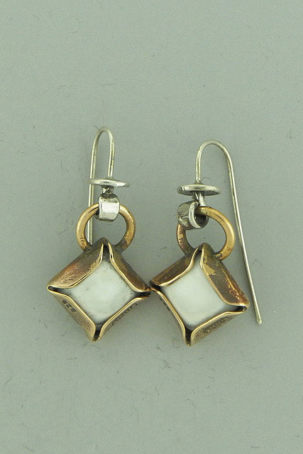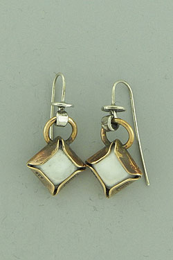 Two tone of sterling silver and Bronze earrings with White Agate stones on hanging silver wires .