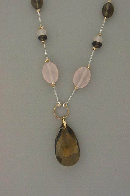 Hand Crafted, sterling silver, fashion necklace with Rose and Smoke Quartz stones.Chain: 16 in. long; Pendent: 1.75 in. long. A total of 17.75 in. long.