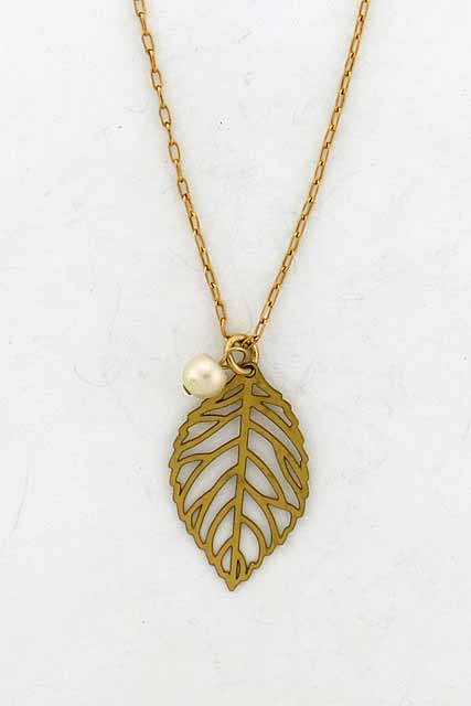 A GF leaf pendent with a white pearl hanging on a GF chain.