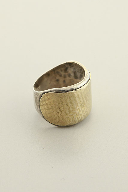 Hand made, two tones band, slightly hammered with a wide hammered gold on top.